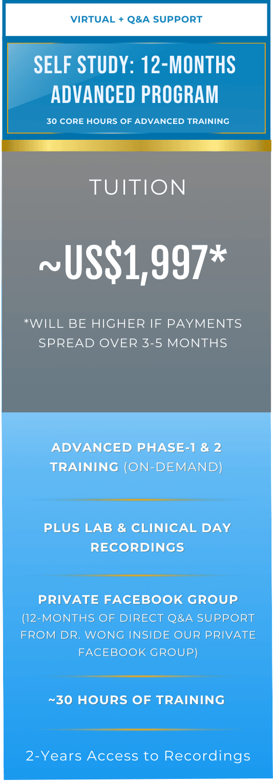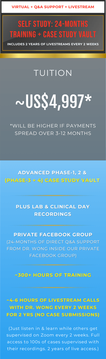 • ​​For those who wish to get access to "Phase-4"...1:1 mentoring and case supervision from Dr. Wong sooner than later (assuming there's mentoring spots open), where you can submit up to 2 to 4 of your own cases every 2-weeks for Dr. Wong's direct feedback (written and verbal), you will be eligible to do so once you complete all 30 hours of core training from Phase 1 and 2 (including the LAB Day and Clinical Day training).